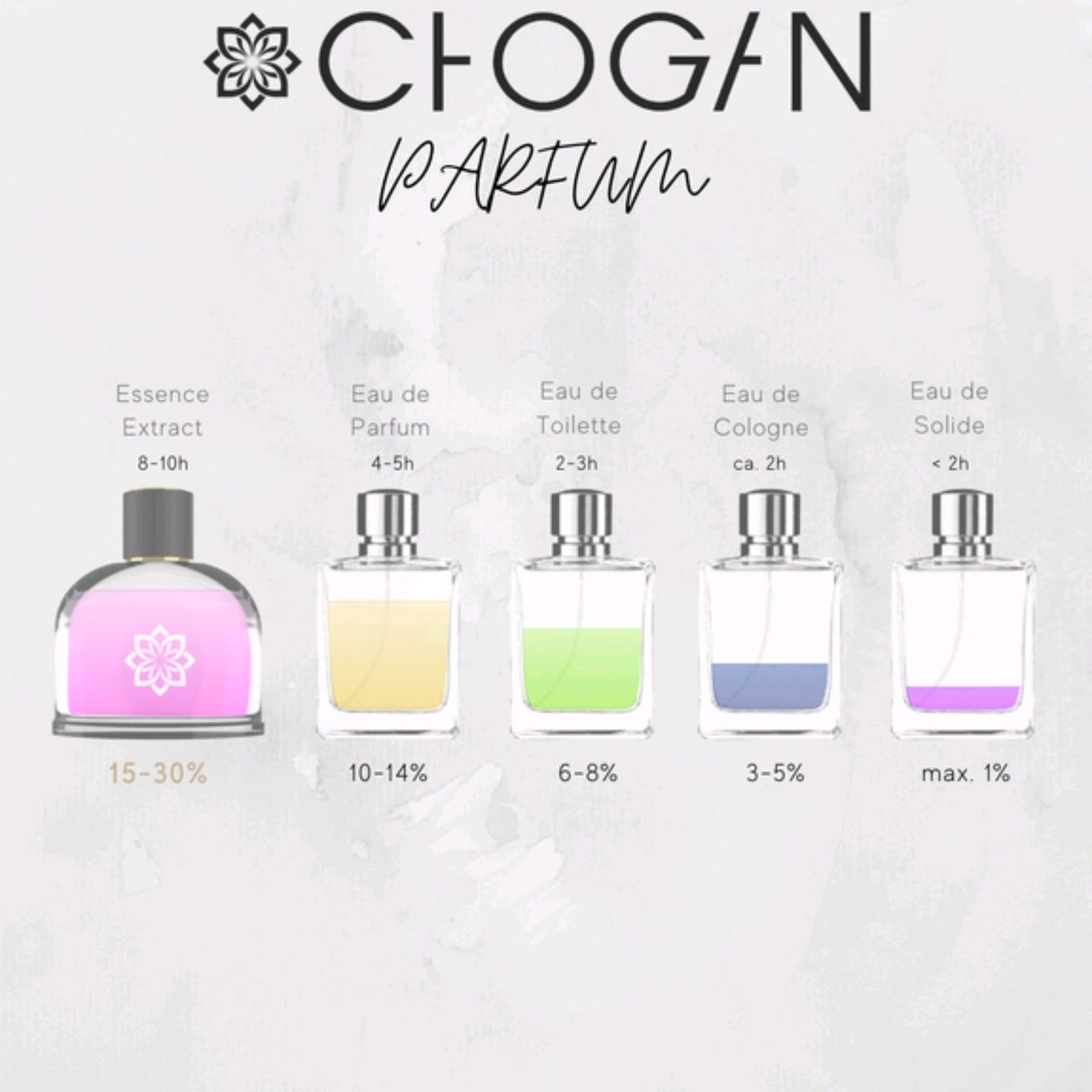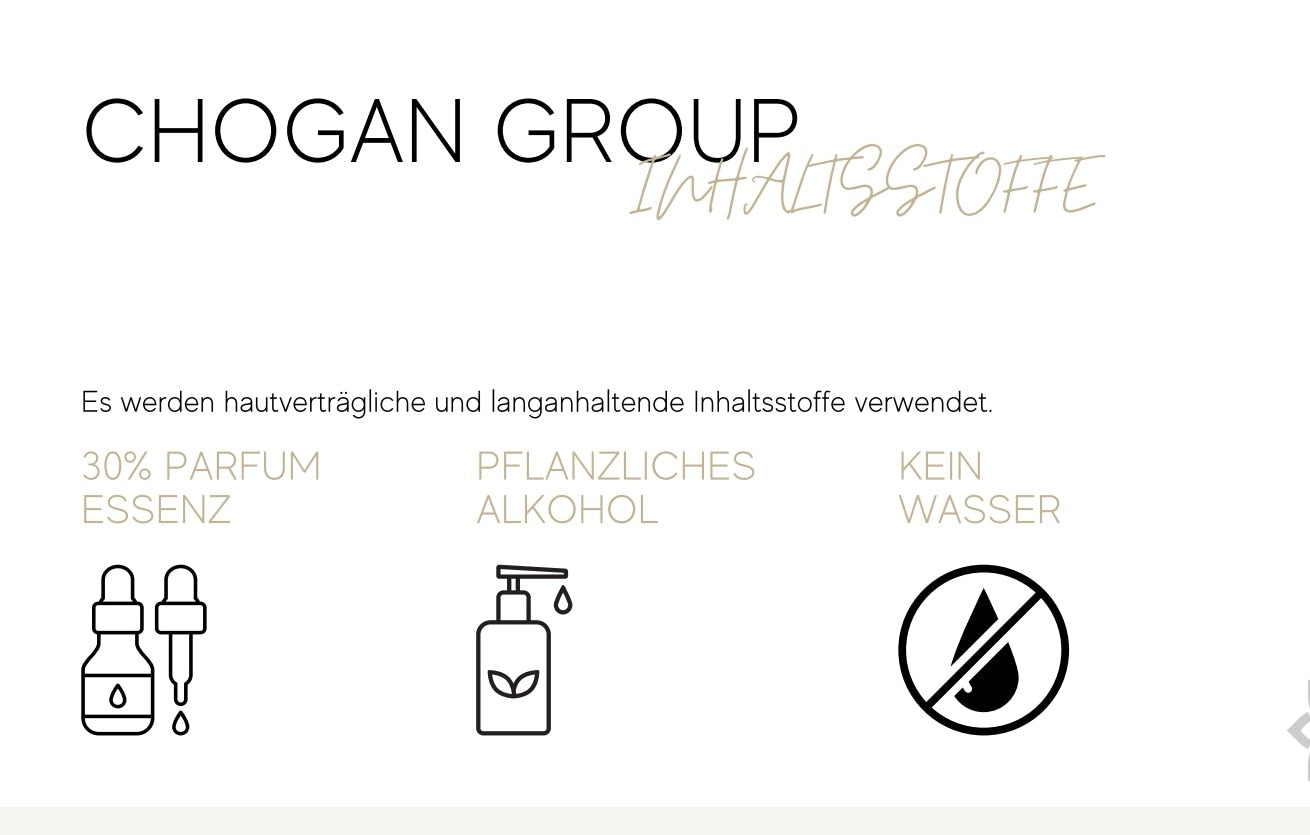 Chogan Parfüms bestehen aus bis zu 30% Essenzen und enthalten kein Wasser und keine chemischen Fixiermittel, sondern nur pflanzliches Alkohol. Im Vergleich zu den namenhaften Düften beinhalten Chogan Parfums prozentual mehr Duftstoffe.